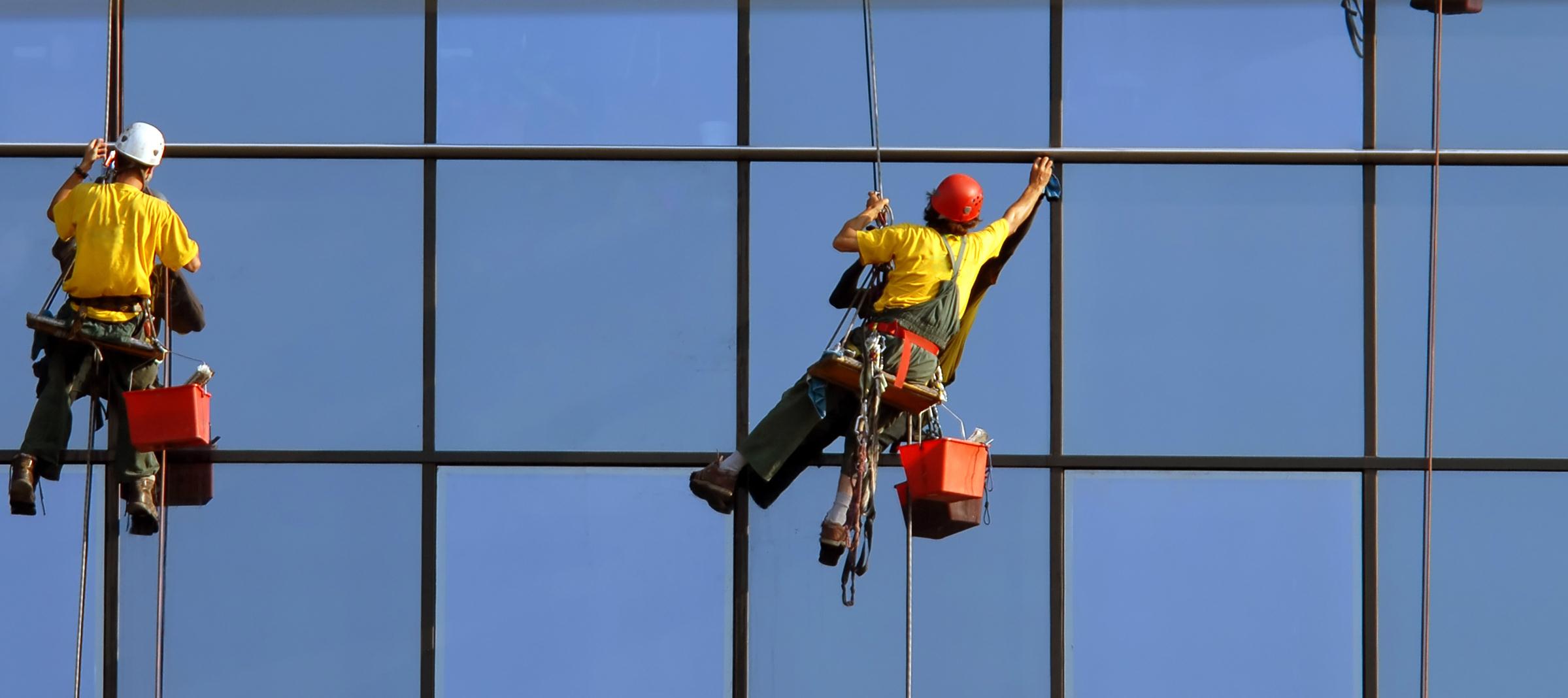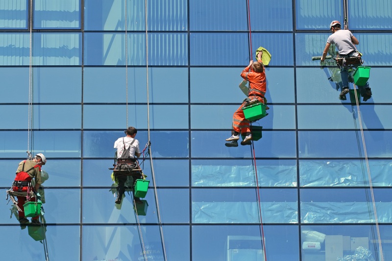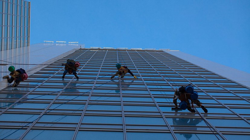 В отличие от строительства, где применяются люльки, леса и подъемные механизмы, специалисты по мытью фасадов используют веревки и другие способы подъема, приемлемые для альпинистов.